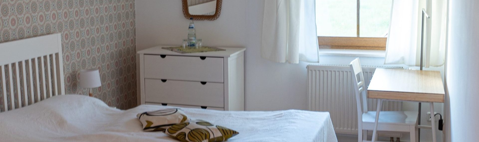 Das Gästezimmer 2 mit Doppelbett (180×200) im romantischen Stil der 70er Jahre. Das helle Zimmer hat einen erfrischend verspielten Charme.
