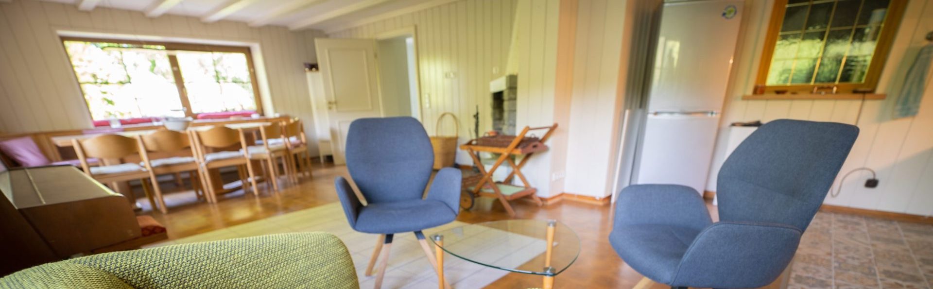 Die Gäste der Gästezimmer können im Aufenthaltsraum frühstücken und sich selbst versorgen. Die Flößerstube hat einen großen, stabilen Holztisch an dem bis zu 12 Personen Platz finden. Das Feuer des offenen Kamins sorgt an kühlen Abenden für eine gemütliche Stimmung und eine angenehme Wärme.